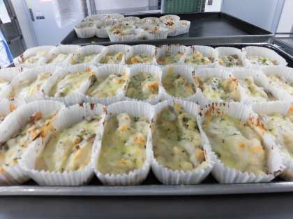 今日は朝から楽しみにしていた子どもたちが多い、マカロニグラタンです。ホワイトソースから手作りで、1個ずつカップに入れました。大きな天板1枚にグラタン30人分をのせて、全校分のグラタンを大きなオーブンで焼きました。