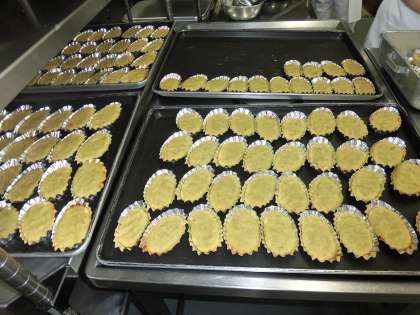 今日のデザートは手作りスイートポテトです。給食室でさつまいもを蒸し、調味料を混ぜ、カップに丁寧に入れました。やさしい甘いがおいしいデザートがオーブンで焼き上がりました。