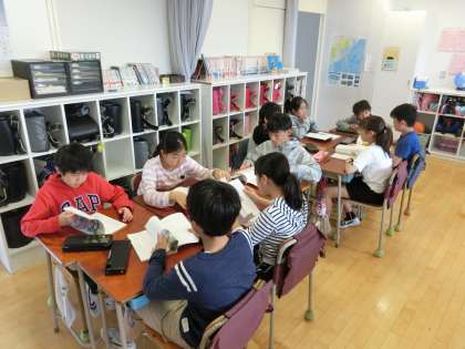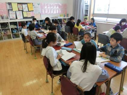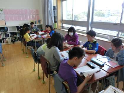 朗読に向けて班で話し合いをしたり、練習をしたりしています。