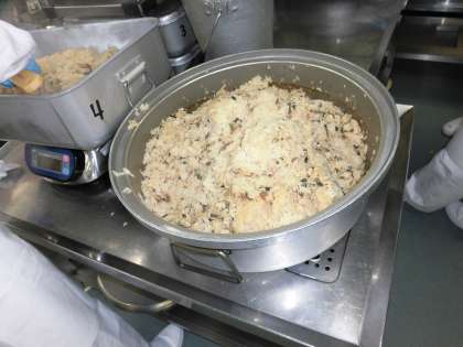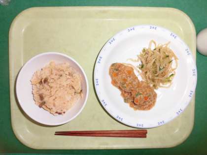10連休が終わり学校生活が再開しました。今日は簡単に盛りつけができる和食献立です。旬の山菜をつかったおこわも1年生は上手に盛りつけていました。