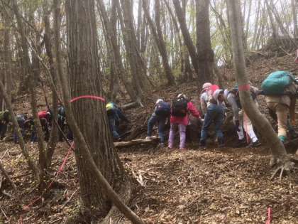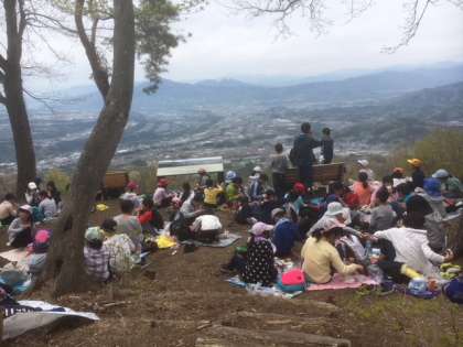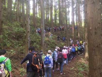 2時間半以上歩いて雨乞山の頂上に着きました。途中急坂に苦しみながらも、助け合いながら全員で登ることができました。友達同士、声を掛け合う姿がたくさん見られました。頂上は素晴らしい景色。景色を見ながらのお弁当は格別ででした。子供たちは、下りの厳しさにまだ気がついていないようです。