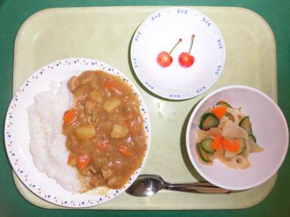 今日のあえものはシャキシャキ野菜です。だいこん・にんじん・れんこんなど歯ごたえのある根菜をあえものにしました。くだものはさわやかな甘みがおいしい旬のさくらんぼです。