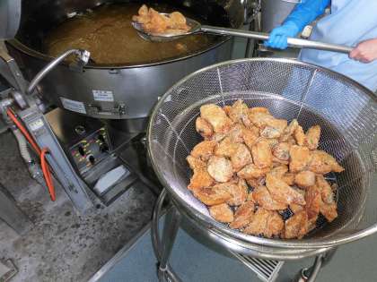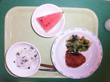 今日の魚はカツオです。カツオには良質なたんぱく質やビタミン・鉄分などが豊富に含まれています。から揚げにしたカツオに南蛮だれをかけた南蛮漬けにしました。カツオを食べなれていない子どもでも、食べやすい調理にしています。