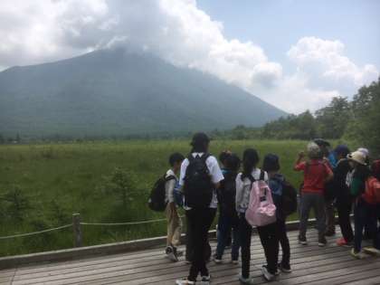 好天に恵まれ、湯滝をスタートに戦場ヶ原をガイドさんにゆっくりと案内していただきながら歩きました。奥日光の自然の美しさ、不思議さを少し感じられたと思います。ただ歩くのではなくよい勉強になりました。最後は暑さもあって子どもたちは疲れも見えていますが、全員が一緒に行動できています。これから昼食、そして日光彫りの体験です、