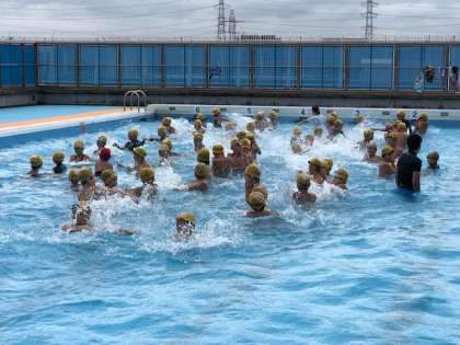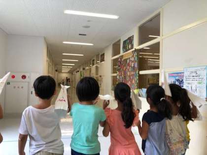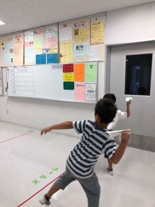 夏休みもあと少し。本日まで夏季水泳指導(高・中学年は実施)及び、から北寺子屋が実施されています。から北寺子屋では、紙ヒコーキを作った子たちが思い思いのヒコーキを飛ばしていました。