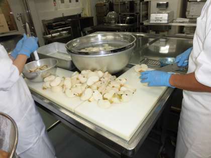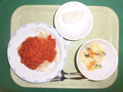 ミートソースにはみじん切りにされたたくさんの野菜とレンズ豆が入っています。じっくり煮込んだソースを、スパゲッテイにたっぷりかけていただきます。果物は旬の梨、130個の梨の皮と芯を切ってます。