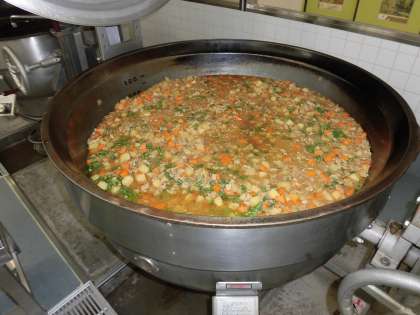 大きな回転釜を使い、煮込んだ肉じゃがができあがりました。玉ねぎは甘味を出すために炒めたものと、食感を出すために角切りにしたものが入っています。たまねぎの甘味がじゃがいもに染みておいしい献立になりました。