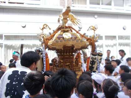 9月24日(火)、烏山神社秋季例大祭で、北小に神輿が来ました。4年生が出迎えて、エールを送りました。神輿にも触れられて大満足でした。