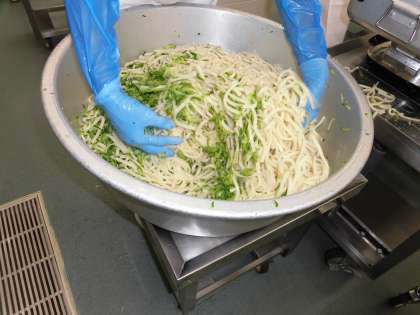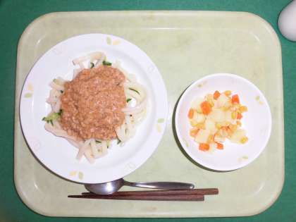今日の応援献立は、じゃんじゃん力がわく ジャージャーうどんです。甘辛みそ味の肉みそを冷やしたうどんにかけました。子どもたちの疲れがピークの今、食べやすくしっかりと疲れがとれるような献立です。きゅうりは水冷したうどんと混ぜているので、後味がさっぱりとします。