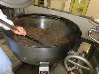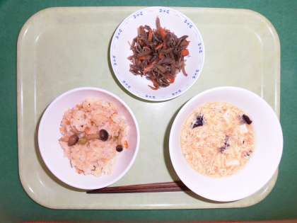 今日の副菜は金平ごぼうです。食べやすい「ささがき」に切ったごぼうを炒めて甘辛い味付けにしました。シャキシャキの歯ごたえの金平ごぼうを食べて、不足しがちな食物繊維をしっかりとることができました。
