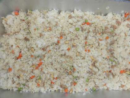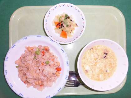 今日はえだまめと大豆をたっぷり入れたチャーハンです。味付けはしょうゆベースのため、子どもたちは食べやすく、しっかり食べています。