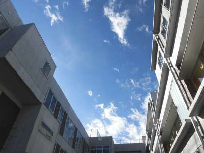 今日はいい天気。気持ちの良い青空が広がっています。でも、風が強いですね。先生たちも歩いていたら、とばされそうになりました。
