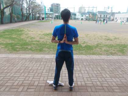 背中の後ろで手を「つないだり」、