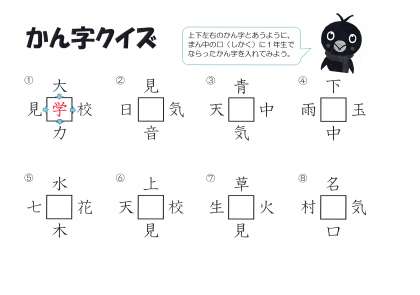 1年生でならったかん字をまん中の□(しかく)に入れると4つのことばができます。