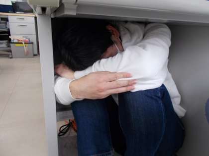先生たちは、今朝シェイクアウト訓練というものを行いました。職員室のどこが安全なのかを考える機会になりました。写真は、今朝の訓練の様子です。