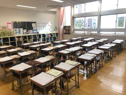 今日、先生たちは17日のぶんさん登校日にわたすプリントやテストなどをみなさんのつくえに配っていました。(上の写真は配り終わった後の教室です)