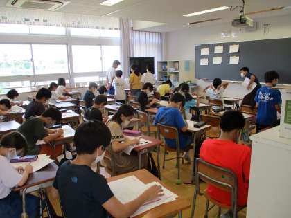 本校では、8月3日〜7日と8月24日〜28日に設定しています。今日は初日ともあって、多くの子どもたちが朝の教室で勉強をしました。朝のうちに頭を働かせることで、生活習慣も規則的になり、生活のメリハリができます。また、1年生の丸付けを学習ボランティアの方々にお手伝いいただいています。