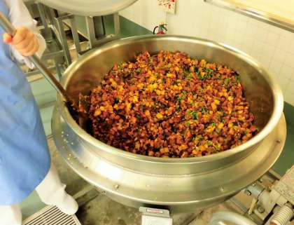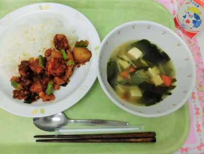今日の主菜は、<豚肉とじゃがいもの甘辛揚げ>です。豚肉、じゃがいも、かぼちゃ、大豆を油で揚げて、特製の甘辛いたれでからめました。白いごはんがすすむ味付けです。どの学級もよく食べていました。