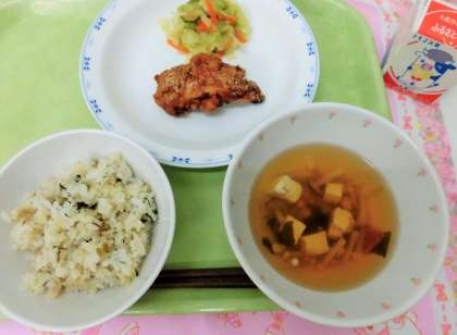 今日の給食は、長野県の郷土料理です。献立表を見て、「山賊焼きって、何だろう?」と疑問に思ったり、展示食を見て、「今日の給食は、唐揚げだ!とてもおいしそう。」と言ってくれた児童もいました。山賊は、物を<取り上げる>のと、鶏肉を油で揚げるの<鶏揚げる>の語呂合わせで、<山賊焼き>という名前がつけられたそうです。