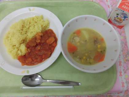 今日の給食は、コロンビアの料理です。コロンビアは、南アメリカ大陸の北東部にあり、首都はボゴタです。<アヒアッコ>は、コロンビアの伝統的な料理です。今日は2種類のじゃがいもを使い、子どもたちが食べやすいようにアレンジして作りました。