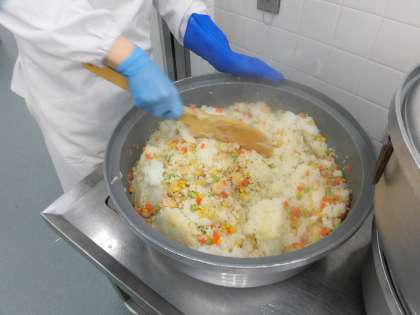 写真は、炊き上がったご飯に、炒めて調味したピラフの具をむらがないように混ぜているところです。