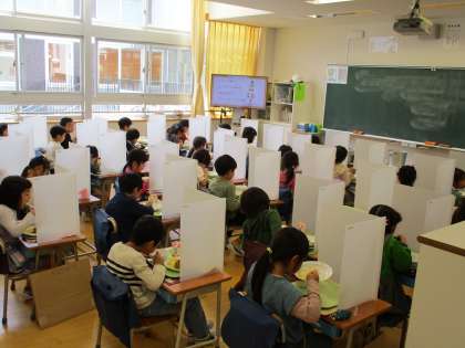 本日から1年生の学校給食が始まりました。配食人数の制限、お替りのしかた、食事中のパーテーションの置き方、静かに食べるなど、感染予防を徹底した新しい様式によって、おいしいくみんなが気を付けて安心して食べました。