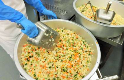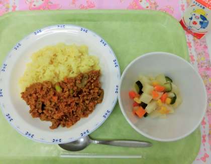 今日から、1年生の給食始まりました。今日の献立は、烏山北小の給食の中でも人気のあるメニューです。<マセドアンサラダ>の「マセドアン」とは、フランス語でさいの目切りの意味があります。サラダの野菜は、調理員さんがすべて手切りで切ってくれました。子どもたちは、とても喜んで食べてくれていたようで、嬉しく思います。