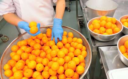 デザートは、冷凍みかんです。納品された冷凍みかんは、給食室で洗い、身が割れていないか、異物がついていないかを確認し、数を数えて配缶します。