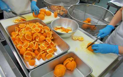 今日の給食のデザートは、愛媛県産のきよみオレンジです。果物は、一つ一つ傷みがないかを確認し、丁寧に洗浄した後、カットしていきます。今日のきよみオレンジは、香りが高く、とてもジューシーな味わいで、美味でした。