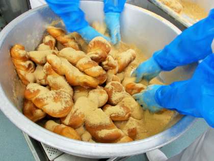 今日の給食は、烏山北小の子どもたちに人気の<きなこ揚げパン>です。高温で短時間揚げたパンに、きなこと砂糖をまぶして仕上げます。