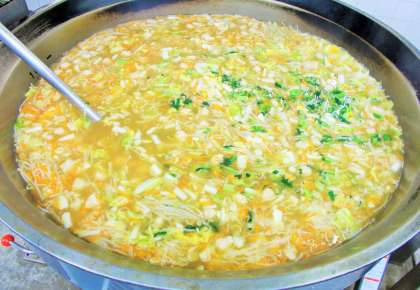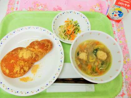 <肉団子入り春雨スープ>も、人気があります。肉団子は、給食室でひとつひとつ丸めて作っています。肉団子には、ひき肉の他に豆腐も入っているので、やわらかな食感です。