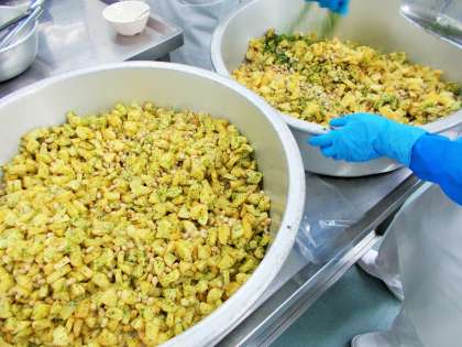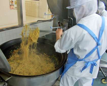 今日の給食は、<塩焼きそば>です。あさり・豚肉・7種類の野菜を使い、塩やオイスターソースなどでさっぱりした味付けに仕上げました。給食の焼きそばは、麺屋から購入した中華麺に、油をまぶしながら丁寧にほぐし、スチームコンベクションオーブンで蒸します。蒸した後、味付けした具と炒め合わせます。麺が短く切れないように、炒めるのも大変です。