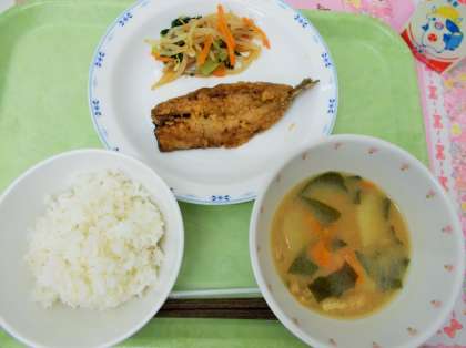 今日、6月11日は入梅です。入梅とは、暦の上で梅雨の季節に入る日です。今日の給食は、<入梅メニュー>です。梅雨の時期にとれるいわしは「入梅いわし」といい、一年の中で一番あぶらがのっていておいしいと言われています。今日は、小骨まで食べられるようにかりっと揚げて、甘辛のたれをからめ、いわしのかば焼きを作りました。子どもたちは、頑張ってもりもり食べていました。