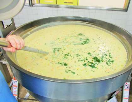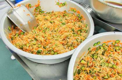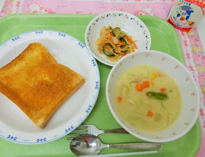 今日のサラダは、<こんにゃくサラダ>です。こんにゃくは、調理員により手切りしたものを使用しています。今日使用したこんにゃくは、全校児童分で15kg。包丁で切る作業はなかなか大変ですが、心をこめて作りました。子どもたちも、こんにゃくの食感を楽しみながら、よくかんで食べていたようです。