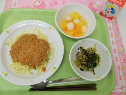 今日の給食は、<ジャージャー麺>です。ゆでた中華麺に特製の肉みそをかけて、いただきます。特製の肉みそには、大豆や豚レバー、たくさんの野菜も入っていて、栄養満点です。今日も、子どもたちはとてもよく食べていました。写真は、生中華麺をゆでた後に、水で冷やしているところです。