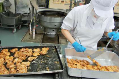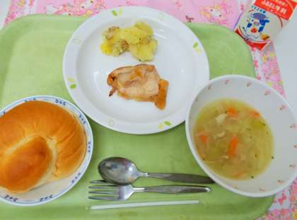 今日の主菜は、<鶏肉のマーマレード焼き>です。レモンやオレンジなどの柑橘類は、お肉をやわらかくする働きがあります。今日は、鶏肉をマーマレードで作った特製ソースに漬け込み、オーブンで焼きました。味がしみ込み、やわらかく焼きあがりました。