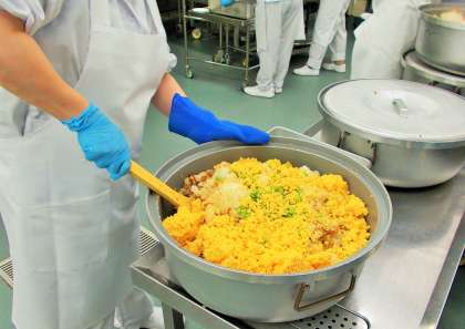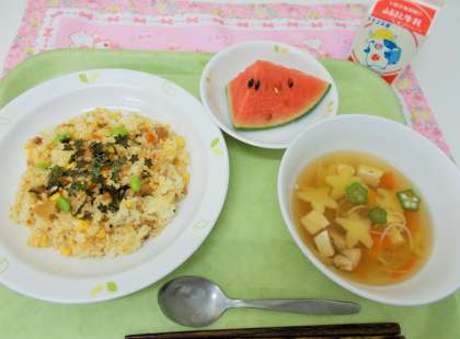 今日の給食には、お星様がかくれています。<七夕汁>にはオクラと星型のかまぼこを使い、<ちらしずし>には星形の焼き海苔をかけていただきます。子どもたちは、たくさんのお星様に喜んでいました。