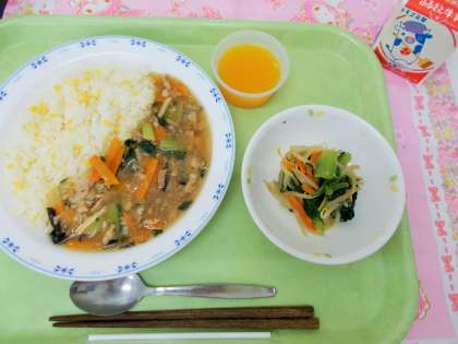 今日の副菜は、<塩ナムル>です。にんにくと塩のきいたタレで野菜を和えました。デザートの<おひさまゼリー>は、おひさまをイメージしたゼリーです。おひさまの色は、みかんジュースとにんじんのすりおろしで作っています。
