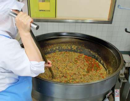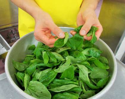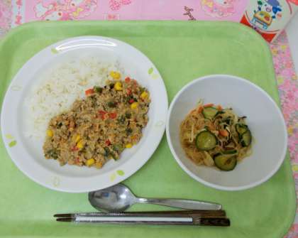 今日の給食は、<ガパオライス>です。ひき肉と野菜・バジルを炒め、ご飯の上にのせて食べるタイ料理を給食風にアレンジして作りました。今日は、生バジルを使っているので、香りが違います。レバーも大豆も入れているので、栄養満点です。子どもたちは、よく食べていました。給食を通して、世界の食文化に目をむけるよい機会になればいいなと思っています。写真は、バジルの葉にいたんでいるとこがないか判別をしているところです。