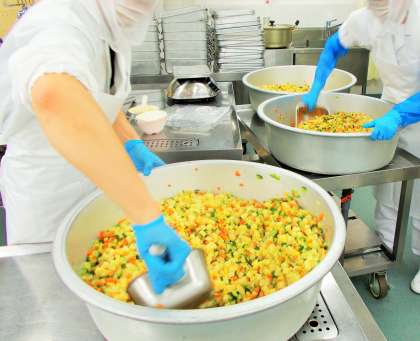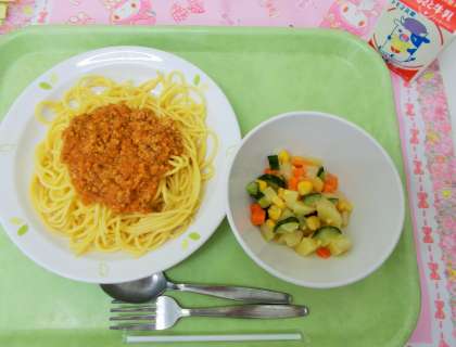 今日から2学期の給食が始まりました。初日のメニューは、子どもたちに人気のある<スパゲッティミートソース>と<マセドアンサラダ>です。どの学級も、とてもよく食べており、嬉しくなりました。