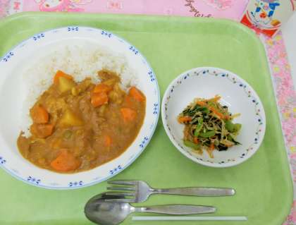 今日のサラダは、<じゃこサラダ>です。ちりめんじゃこを油でいため、ゆでて冷却した野菜と特製ドレッシングと一緒にいただきます。ちりめんじゃこには、骨や歯を強くするカルシウムが豊富に含まれています。成長期の子どもたちに、ぜひ好きになってほしい食材です。