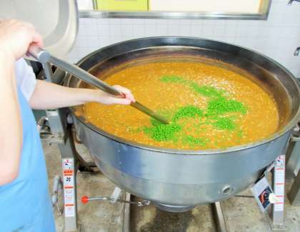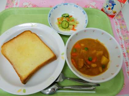 今日の主食は、<シュガートースト>です。塩分をおさえるため、無塩食パンにバターと砂糖をあわせたものを塗り、オーブンで焼きました。無塩食パンは、そのままで食べると美味ではありませんが、シュガートーストやピザトーストなどに加工すると美味しく食べることができ、塩分摂取もおさえることができます。子どもの頃から、塩分をあまりとり過ぎないようにしましょう。
