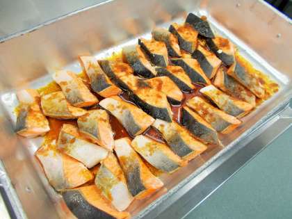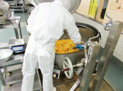 写真は、鮭にねぎソースをかけているところと、じゃがいもの甘辛煮を食缶に配缶しているところです。