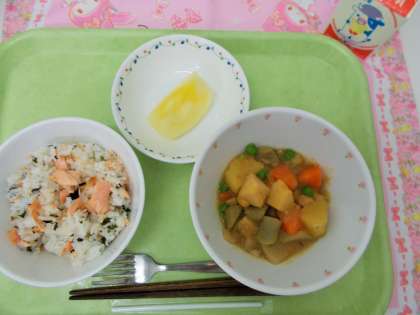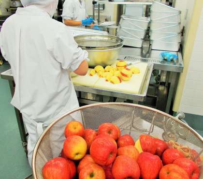 今日のくだものは、りんごです。今日は、青森県産のサンフジという品種で、密入りのりんごでした。りんごは、給食室で皮をむき、カットしています。