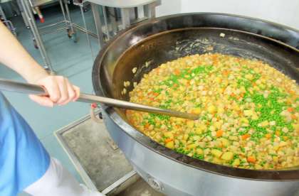 主菜の<豆入り筑前煮>は、2釜で煮ています。味は、低学年用と高学年用の2段階の塩分に仕上げています。