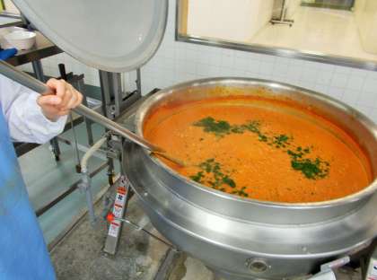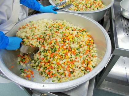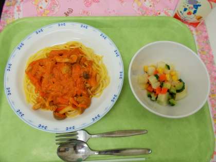 今日のサラダは、烏山北小学校で人気のある<マセドアンサラダ>です。マセドアンサラダの「マセドアン」とは、フランス語でさいのめ切りという意味があります。今日のサラダの野菜は、調理員さんがすべて包丁で切ってくれました。感謝の気持ちをもち、おいしくいただきました。