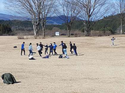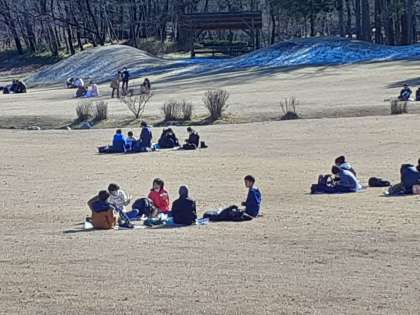昼食を食べて、広い芝の公園で、遊んでいます。