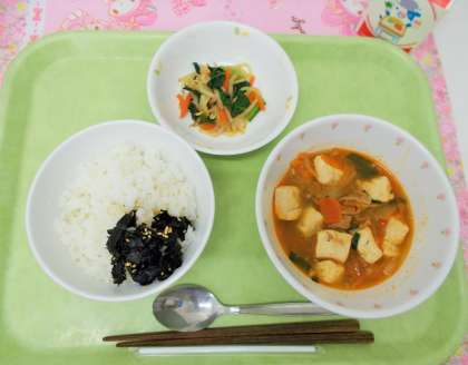 今日の主菜は、韓国料理の<豆腐チゲ>です。豆腐の他に、豚肉や野菜もたっぷり入っているので、栄養満点です。見た目は辛そうな色をしていますが、辛さは控えめです。にんにくやしょうがもたくさん入っているので、食べると体がぽかぽか温まります。子どもたちも、もりもり食べてくれていました。