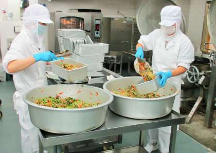 写真は、ゆで野菜を配缶しているところです。