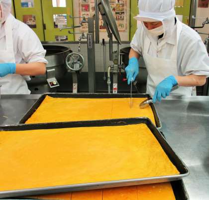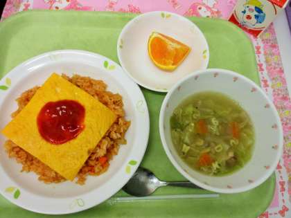 今日の給食は、<オムライス>です。給食では、ご家庭やお店で食べるオムライスのように、とろとろの卵のオムライスは出すことができませんが、子どもたちは喜んで食べてくれていたようです。「どうして四角い卵なの?」と子どもたちから質問されました。給食では、写真のように四角い天板に卵液を流し、オーブンで焼いたものを切り分けるため、四角い卵になります。